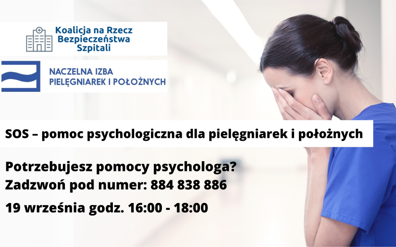 w związku z alarmującymi danymi na temat stresu wśród personelu pielęgniarskiego Koalicja na rzecz Bezpieczeństwa Szpitali razem z Naczelną Izbą Pielęgniarek i Położnych uruchamia specjalny dyżur infolinii SOS z pomocą psychologiczną dla pielęgniarek i położnych. W dniu 19 września w godzinach 16:00 – 18:00 każda chętna osoba może zadzwonić pod numer: 884 838 886 i skorzystać z bezpłatnej pomocy psychologa. Konsultacje poprowadzi Dorota Uliasz, psycholog z ponad 20-letnim doświadczeniem. Podczas swojej kariery zawodowej współtworzyła z Naczelną Izbą Pielęgniarek i Położnych projekt: SOS – pomoc psychologiczna dla pielęgniarek i położnych w czasie pandemii.