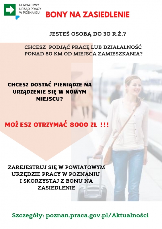 Powiatowy Urząd Pracy w Poznaniu posiada wolne środki finansowe na bony na zasiedlenie dla osób do 30 r. ż. zainteresowanych podjęciem pracy/działalności oraz na dotacje na uruchomienie własnej firmy (niezależnie od wieku).