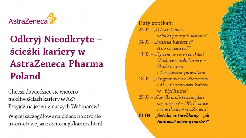 Zapraszamy na ostatni webinar z cyklu "Odkryj nieodkryte - ścieżki kariery w AstraZeneca Pharma Poland”, przygotowany z myślą o studentach i absolwentach zainteresowanych podjęciem pracy w AstraZeneca Pharma Poland, innowacyjnej firmie biofarmaceutycznej, skoncentrowanej na przesuwaniu granic nauki, aby dostarczać leki zmieniające życie pacjentów na całym świecie.